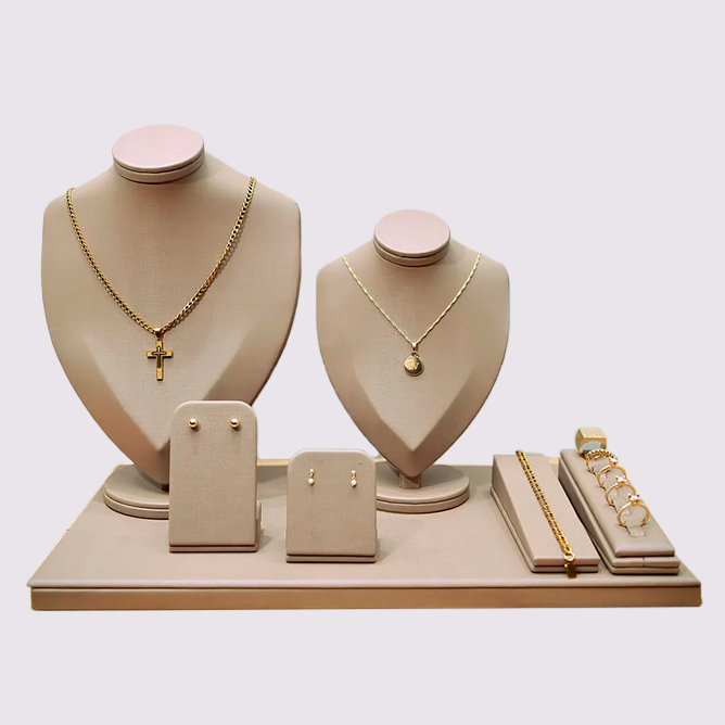 Produzido com o material Factor, conhecido pela sua resistência e acabamento premium, o kit é composto por 7 expositores pensados para destacar com equilíbrio colares, brincos, pulseiras e anéis. Tudo com o toque elegante e versátil da cor pérola.
