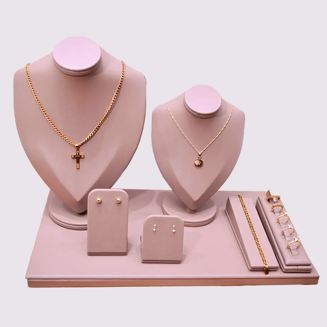 Produzido em Factor, um material resistente, refinado e com excelente acabamento, o kit é composto por 7 peças que acomodam com perfeição brincos, colares, anéis e pulseiras, organizando sua vitrine com beleza e profissionalismo.